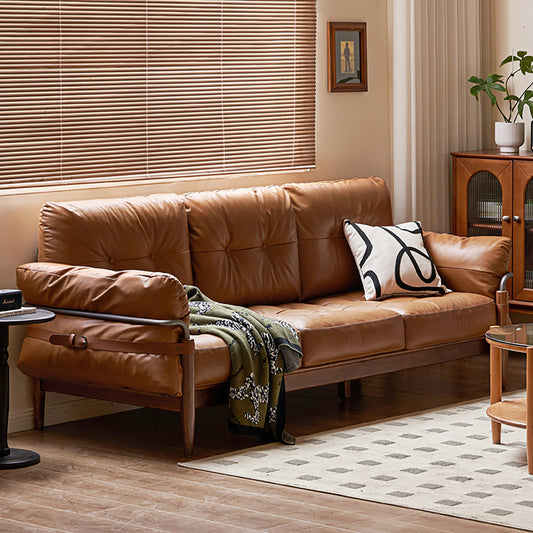 Walnut Solid Wood Sofa - Modern Retro Design with Genuine Leather & Down Cushion