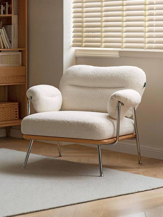 Nordic Shearling Accent Chair - Washable Cream Lounge Chair with Iron Frame & Oak Base