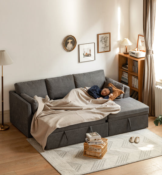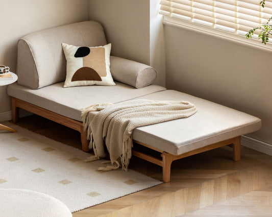 Title: Solid Wood Convertible Sofa Bed - Space-Saving Fold-to-Bed Design with Organic Linen & Oak Frame